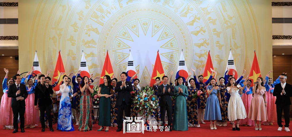 베트남 태고 연주단의 연주로 시작된 국빈만찬은 베트남 전통 모자 공연과 한국 부채춤으로 이어졌으며, 공연단의 마지막 아리랑 합창 순서에서는 윤석열 대통령과 김건희 여사, 트엉주석 내외가 함께 무대에 오르며 2시간 넘게 이어진 신뢰와 우정의 시간을 마무리 했습니다.