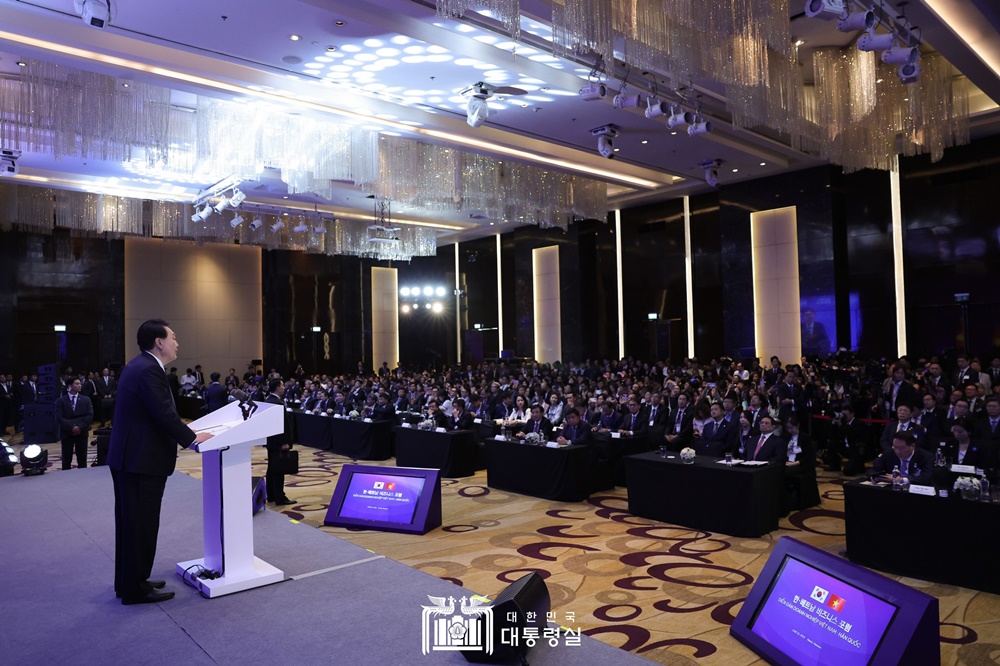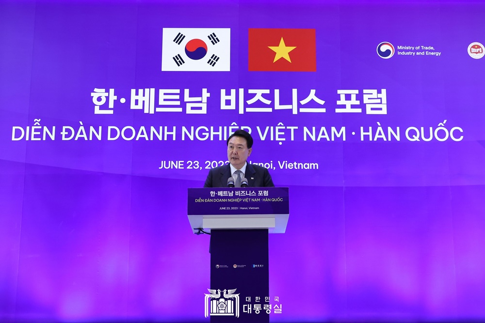 윤석열 대통령은 오늘(현지시간 6. 23, 금) 양국 기업인 600여 명이 참석한 가운데 개최된 한-베트남 비즈니스 포럼에 참석하여, 새로운 30년을 열기 위한 파트너쉽 방안을 제시했습니다.